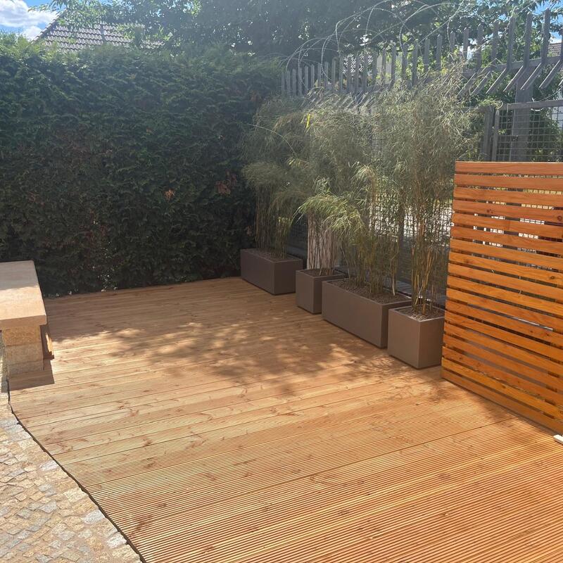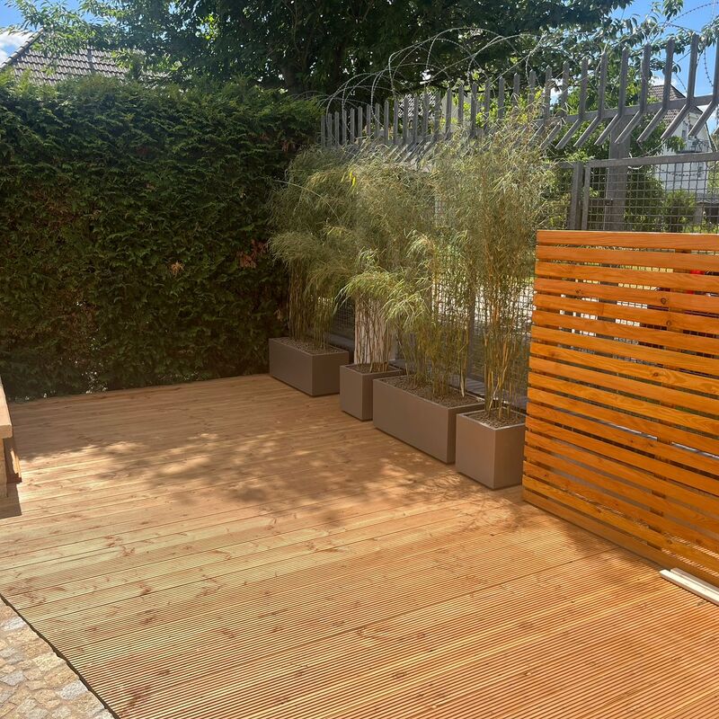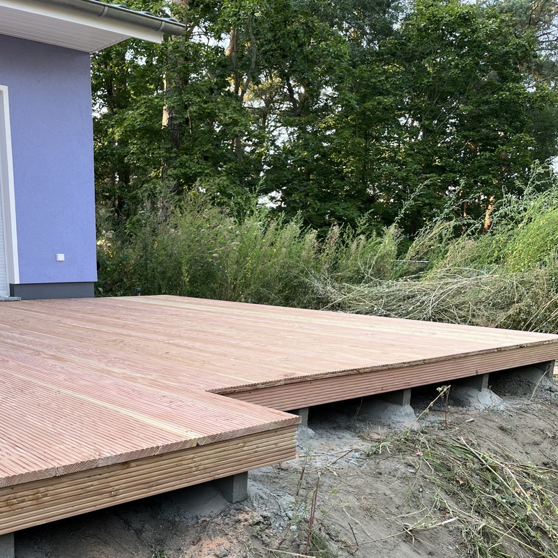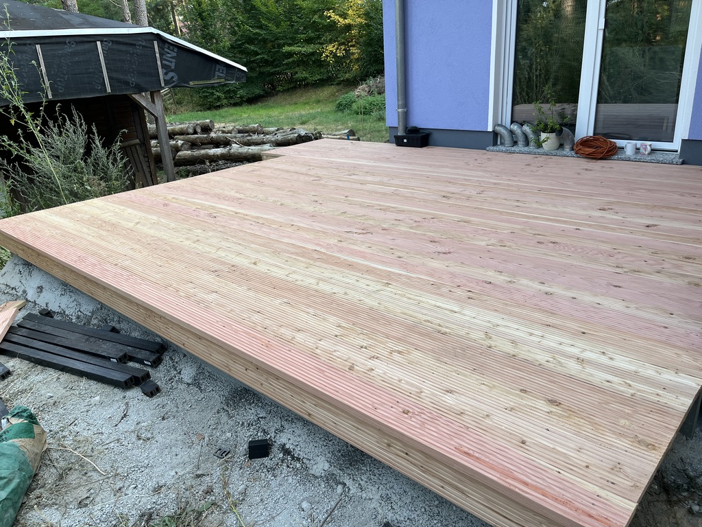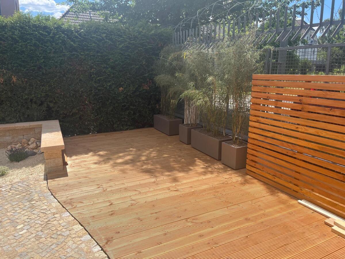 Unsere Kunden wünschten sich eine markante und passende Terrasse mit viel Liegefläche und Platz für die Kinder zum spielen.